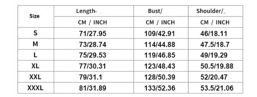 Note: 1. Asian sizes are 1 to 2 sizes smaller than European and American people. Choose the larger size if your size between two sizes. Please allow 2-3cm differences due to manual measurement. 2. Please check the size chart carefully before you buy the item, if you don't know how to choose size, please contact our customer service. 3.As you know, the different computers display colors differently, the color of the actual item may vary slightly from the following images.
